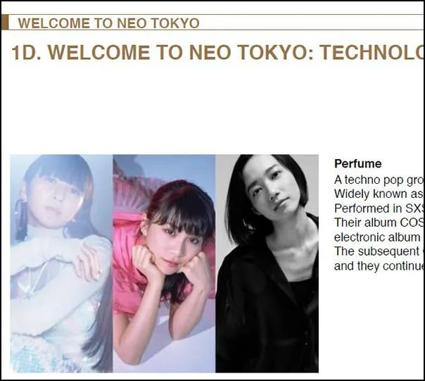 随后会场点亮倒计时。当计数归零,会场中央的穹顶开裂,露出高台舞台。高台上出现日本当红女子组合Perfume的三人组。同时使用立体投影技术,投射出东京街景。