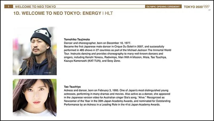这一版方案创作的领导者是女性编舞家MIKIKO。其实一开始奥运会开幕式实际总导演的人选并不是她。但随着山崎宏和野村万斋此前相继下马,MIKIKO于2019年6月临危受命,实际承担起创作使命。而此时距离奥运会原定开幕时间只有一年零一个月。