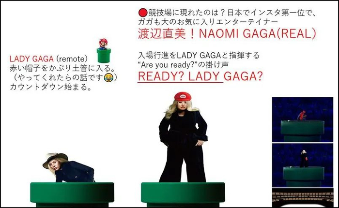佐佐木还往里加了一些极其无厘头的表演:比如叫Lady Gaga戴着马里奥的红帽子钻进水管后,过一会儿钻出一个同样打扮的渡边直美。他也知道这方案不太靠谱,还标注了个“请的来Lady gaga才行”。