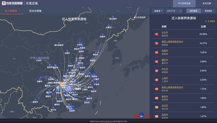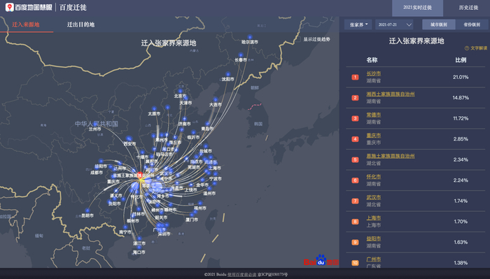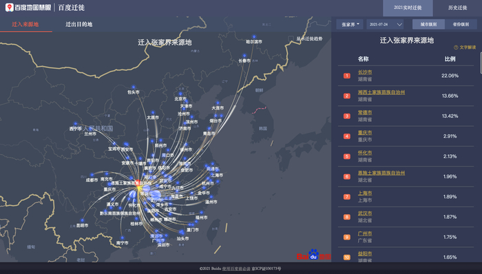 记者查阅百度地图慧眼的迁徙大数据则显示,7月20日到24日,迁入张家界的城市中,长沙,常德排在前列,其次是外省的重庆,怀化,上海,益阳,武汉,广州,深圳等。