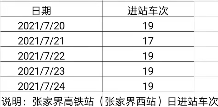 高铁管家的数据显示,7月20日到24日,进站张家界西站到列车基本都是19个车次(21日为17个车次)。