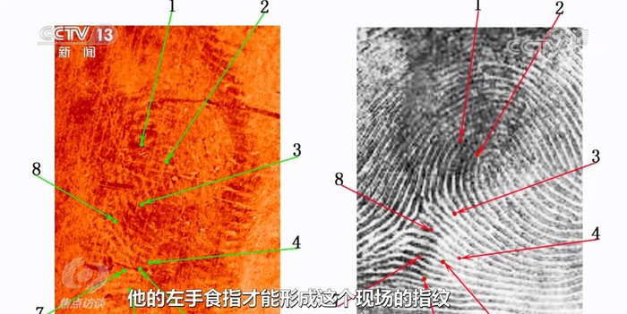 崔道植说:“它这个形状,对周围其它纹线之间的关系,这个认识上我下了很大的工夫,一共用了九天时间反复比对结果是,只有这个人,他的左手食指才能形成现场的指纹,别人是形不成的。”