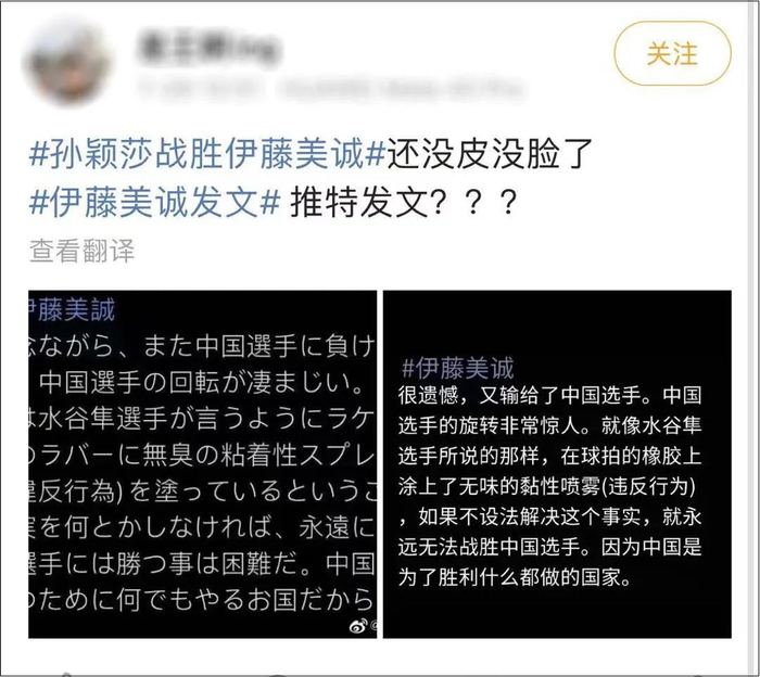 7月29日的女单半决赛后,社交网络上开始流传一张推特截图,并有类似“伊藤美诚推特”的标签出现。部分截图还自带翻译,质疑中国选手在球拍上违规涂上无味的粘合剂喷雾,为了胜利不择手段。