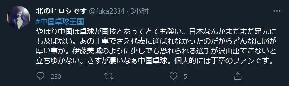 随后,这名用户又发布数条推文,解释了自己对中国乒乓球的看法。他在第一条推文中说:“毕竟中国的乒乓球是国技,所以很强,日本还远远不够。连丁宁都没能入选国家队,这说明队伍(阵容)有多深厚。如果没能有许多像伊藤美诚那样多少令人害怕的选手出现,日本就无法立足。不愧是厉害的中国乒乓,我个人是丁宁的粉丝。”