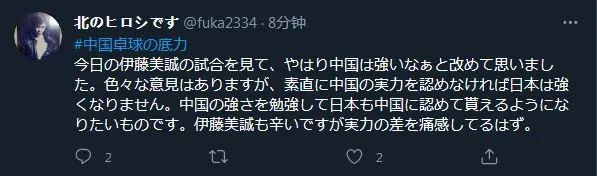 “看了今天伊藤美诚的比赛,再次觉得中国果然很强。虽然有各种各样的意见,但如果不坦率地承认中国的实力,日本就不会强大。学习中国的强大,日本也想得到中国的认可。虽然伊藤美诚也很辛苦,但应该也痛感实力的差距。”