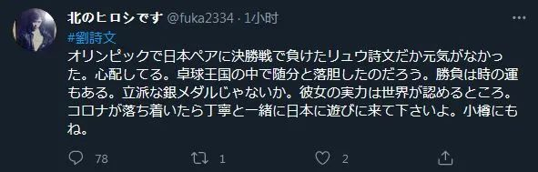 他在第三条推文中提到了刘诗雯:“奥运会混双决赛中输给日本的刘诗雯也没有精神,我很担心(她)。乒乓球王国也相当沮丧吧。胜负取决于一时的运气。这不是很棒的银牌吗?她的实力是世界公认的。等新冠疫情过后,一起和丁宁来日本玩吧,也来小樽。”