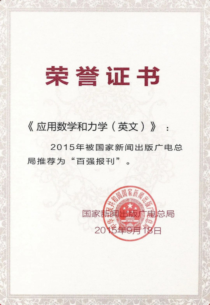 今年6月30日,科睿唯安发布的期刊引证报告(Journal Citation Report)中显示,AMM的2020年度影响因子为2.866,在265种应用数学学科期刊中排名第30名,稳步保持在Q1区;在136种力学学科期刊中排名第54名,位列Q2区。AMM曾获得“国家期刊奖百种重点期刊”(国家新闻出版总署)、“中国高校精品科技期刊奖”(教育部,连续五届)、“百强报刊”(国家新闻出版广电总局)、“中国最具国际影响力学术期刊”(连续九届),以及“中国最美期刊”“中国高校科技期刊优秀网站”“中国高校优秀英文期刊”等多项荣誉。今年7月获得“第五届中国出版政府奖”提名奖。