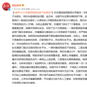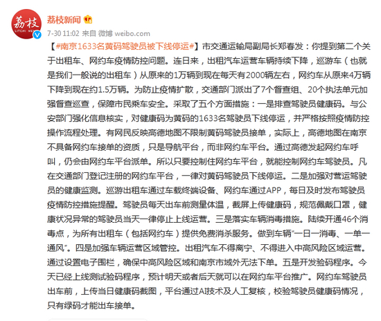 [南京1633名黄码驾驶员被下线停运]市交通运输局副局长郑春发:你提到第二个关于出租车、网约车疫情防控问题。连日来,出租汽车运营车辆持续下降,巡游车(也就是我们一般说的出租车)从原来的1万辆到现在每天有2000辆左右,网约车从原来4万辆下降到现在约1.5万辆。为防止疫情扩散,交通部门派出了7个督查组、20个执法单元加强督查巡查,保障市民乘车安全。采取了五个方面措施:一是排查驾驶员健康码。与公安部门强化信息核实,对健康码为黄码的1633名驾驶员下线停运,并严格按照疫情防控操作流程处理。有网民反映高德地图不限制黄码驾驶员接单,实际上,高德地图在南京不具备网约车接单的资质,只是导航平台,而非网约车平台。通过高德发起网约车呼叫,仍会由网约车平台派单。所以只要控制住网约车平台,就能控制网约车驾驶员。凡在交通部门登记注册的网约车平台,一律对黄码驾驶员下线停运。二是加强对营运驾驶员的健康监测。巡游出租车通过车载终端设备、网约车通过APP,每日及时发布驾驶员疫情防控措施提醒。驾驶员每天出车前测量体温,截屏上传健康码,规范佩戴口罩,健康状况异常的驾驶员当天一律停止上线运营。三是落实车辆消毒措施。陆续开通46个消毒点,为所有出租车(包括网约车)提供免费消杀服务。做到车辆“一日一消毒、一单一通风”。四是加强车辆运营区域管控。出租汽车不得离宁、不得进入中高风险区域运营。通过设置电子围栏,确保中高风险区域和南京市域外无法下单。五是开发验码程序。今天已经上线测试验码程序,预计明天或者后天就可以在网约车平台推广。网约车驾驶员出车前,上传当日健康码截图,平台通过AI技术及人工复核,校验驾驶员健康码情况,只有绿码才能出车接单。