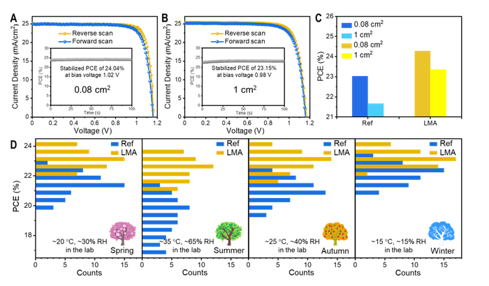 图3:液相介质退火制备的小面积(A)与大面积(B)钙钛矿太阳能电池J-V曲线以及稳态效率;传统退火(Ref)与液相介质退火(LMA)得到的大小面积电池效率差异对比(C);一年四季不同退火条件下得到的器件性能统计(D)。