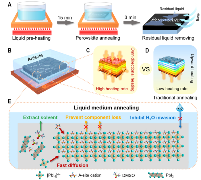 针对这一问题,我们开发了一种简单的钙钛矿薄膜退火工艺——液相介质退火。如图1所示,将事先沉积好的湿膜浸没于特定温度的液相介质中退火,即可得到高质量的钙钛矿薄膜。该“液相介质”不仅提供了均匀的热场促进钙钛矿薄膜的均匀生长,还构筑了稳定的化学环境有效限制钙钛矿生长过程中的副反应。这一方法为可重复的制备高质量,组分相态空间分布均一的钙钛矿薄膜提供了解决方案。