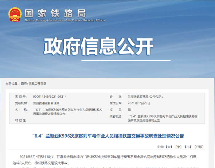 国家铁路局官网7月29日发布《“6.4”兰新线K596次旅客列车与作业人员相撞铁路交通事故调查处理情况公告》。详情如下: