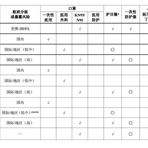 防护服则无论是国内航班还是国际航班都不是必选防护装备,仅在表格后备注了高风险航班建议清洁人员穿长衣(或袖套)、长裤,防止皮肤裸露,回收医疗垃圾建议佩戴护目镜/面屏。
