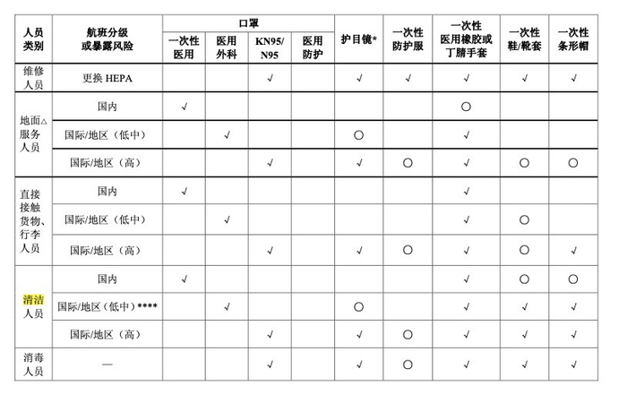 在附表即各类人员个人防护参考建议中,清洁人员的防护用具以国内、国际(低中风险)、国际(高风险)三个航班分级风险来确定。