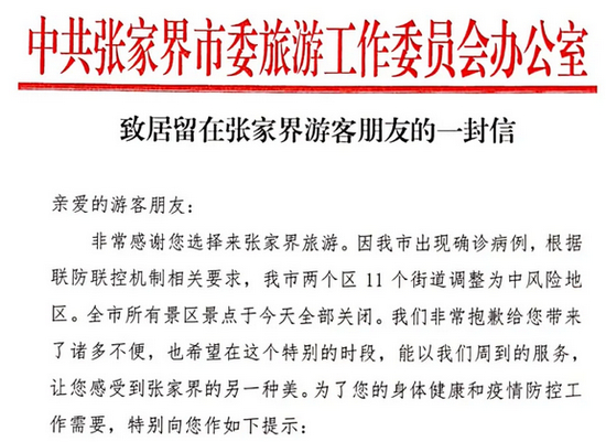 值得注意的是,从30日上午起,张家界市所有景区景点关闭。当日,张家界的一组闭园海报在网络疯转,海报文案令无数网友泪目。