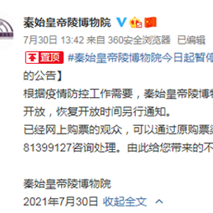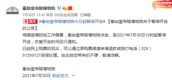 7月30日,西安秦始皇帝陵博物院等景区暂时关闭。