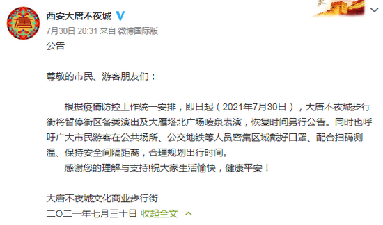 30日晚上,西安大唐不夜城文化商业步行街发布公告,街区各类演出及大雁塔北广场喷泉表演即日起暂停,恢复时间另行公告。
