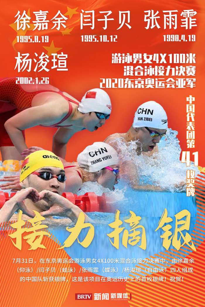 7月31日,在东京奥运会游泳男女4×100米混合泳接力决赛中,由徐嘉余(仰泳)/闫子贝(蛙泳)/张雨霏(蝶泳)/杨浚瑄(自由泳)四人组成的中国队以3分38秒86的成绩斩获银牌,这是该项目在奥运历史上的首枚银牌!祝贺!