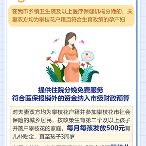 除了育儿补贴金,攀枝花还在“生”、“育”、“学”方面提出多项保障性措施。如对攀枝花户籍产妇提供住院分娩免费服务,符合医保报销外的资金纳入市级财政预算;鼓励用人单位、国有企业、产业园区单独或联合设置婴幼儿照护服务机构,为职工提供福利性婴幼儿照护服务等。