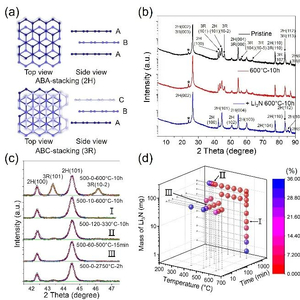 中国科学技术大学朱彦武教授团队经过长期研究发现,在石墨粉体中加入少量氮化锂(Li3N)晶体粉末,即可在较低温度下(最低至350 ℃)实现大范围片径尺寸(1 ~ 60 μm)宏量石墨粉体(百克量级)中的3R相向2H相完全转变。在来自西北工业大学、国防科技大学、中科院半导体所和曼彻斯特大学等团队的合作研究帮助下,团队发现该条件下石墨相变机理为:功函数差异导致氮化锂晶体粉末在接触石墨时将部分电子转移至石墨的共轭π电子云,使得石墨层间距异常增大,从而显著降低石墨层间滑移能垒,使得3R相得以在更加温和条件下转变为2H相。