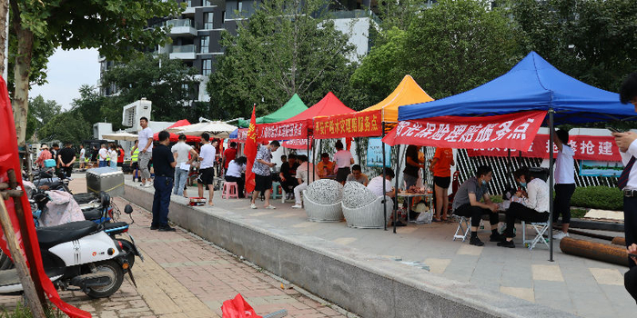 7月28日,经济观察报记者在郑州各小区门外看到,多家保险公司工作人员在临时搭建的服务点雨棚中忙碌地处理客户理赔业务,不断有业主前来向保险公司咨询。