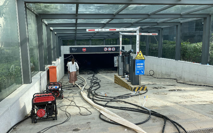 随后,记者跟随一位业主张宇(化名)到该小区地库查看情况,通往地下车库的楼梯上仍有大量湿滑的淤泥,在负二层,记者看到,仅有为数不多的几盏灯亮着,部分车辆还停在里面,其中不乏大量捷豹、路虎等豪车。物业公司的小型抽水设备还在地库入口和楼梯上持续向外抽水。由于负三层淤泥太多,沼气太重,记者一行便没有进入查看。