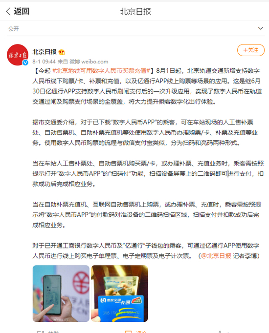 8月1日起北京地铁可用数字人民币买票充值