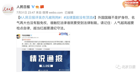中央政法委机关报@法治日报: “吴亦凡事件”早已不再是沾染着桃色气息的娱乐八卦,而是实实在在的涉法事件,也为全社会上了一堂很扎实的法治课——法律面前人人平等,正义面前没有“顶流”!不枉不纵,以事实为依据,以法律为准绳。让子弹飞一会儿,这不仅关乎对受害人的保护,也关乎整个社会的公平正义。吴亦凡被刑拘也再一次证明,法律不会因炒作而歪曲,也不会因流量而姑息,法不纵恶!