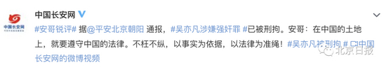 昨晚,北京市公安局朝阳分局发布消息称:针对网络举报的“吴某凡多次诱骗年轻女性发生性关系”等有关情况,经警方调查,吴某凡(男,30岁,加拿大籍)因涉嫌强奸罪,目前已被朝阳公安分局依法刑事拘留, 案件侦办工作正在进一步开展。