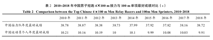 表2显示, 自“接力促单项”策略实施后, 中国男子接力队年度最好成绩稳定在39 s以内, 世界排名达第4名; 中国运动员个人年度最好成绩稳定在10.25 s以内, 其中, 2018年, 苏炳添在0.2 m/s顺风的情况下, 以9.91 s的成绩平亚洲纪录, 在雅加达亚运会男子100 m决赛中, 以9.92 s夺冠并打破亚运会纪录。世界一流的个人100 m短跑成绩充分体现了“接力促单项”策略的适用性。