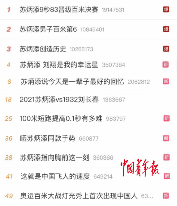东京奥运会男子100米半决赛上,苏炳添以个人最好成绩9秒83,创造新的亚洲纪录。决赛中,他以9秒98的成绩,完成了中国运动员在奥运百米决赛上的首秀。