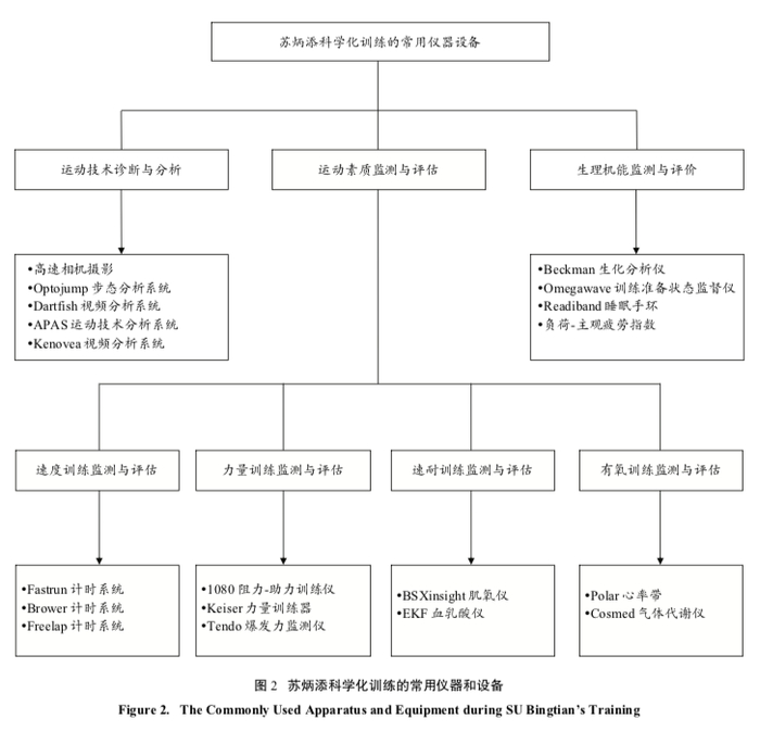 以笔者自身为例, 2017年11月与Randy教练合作之初, Randy教练所做的第一件事情就是参照“冠军模型”对笔者的体能和技术状况进行全面的诊断和分析。然后, 针对笔者体能 (股后肌群力量和踝关节力量不足、主动下地速度和发力速率偏慢) 和技术 (起跑姿势不合理、前7步步长偏小、扒地技术不合理、全程呼吸和速度节奏不佳) 方面存在的问题, 制订了针对性的训练方案。经过一年多的针对性训练, 笔者在上述技术参数和身体素质方面取都得到了明显进步, 这也正是笔者取得突破的关键所在 (表1) 。在日常训练过程中, Randy教练会以训练前Omegawave评测结果和运动员的主观感受调查结果为依据, 确定运动员当天的速度、耐力、爆发力、力量、协调和技术训练的负荷量度, 以保证运动员在避免损伤和过度训练的前提下获得最佳的训练效益。在专项素质训练过程中, Randy也会通过多种科研仪器设备进行全面监控 (图2) , 以确保训练负荷量度和运动技术的最佳化。