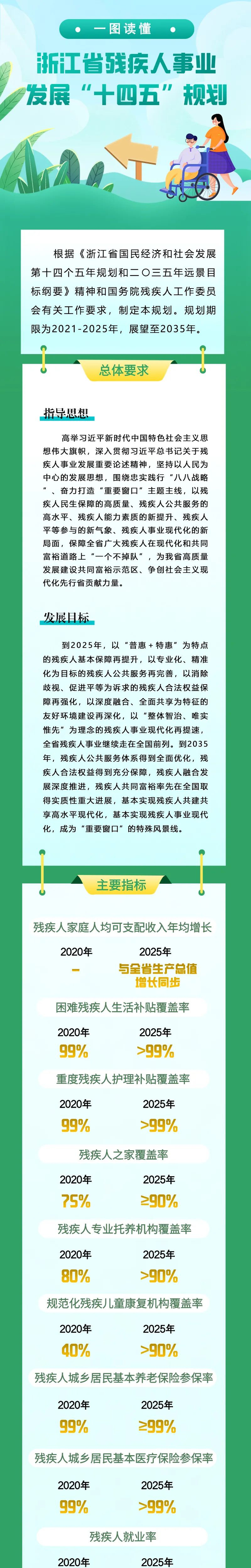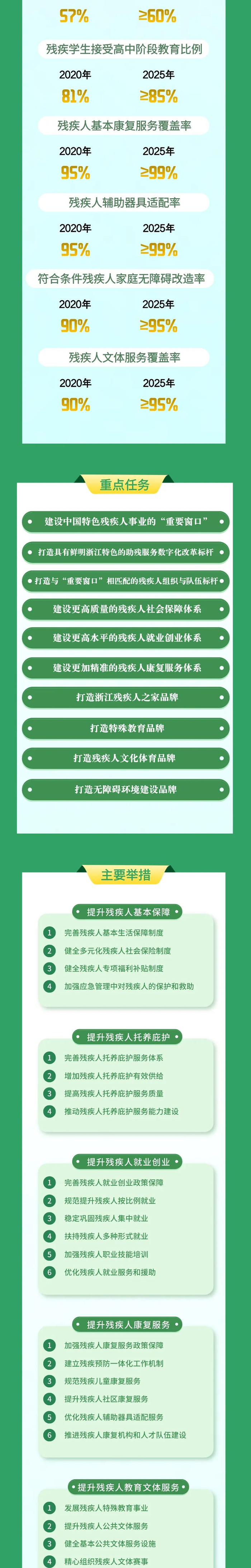 为进一步推进“十四五”时期全省残疾人事业现代化进程,省政府近日印发《浙江省残疾人事业发展“十四五”规划》,提出到2025年,浙江以“普惠+特惠”为特点的残疾人基本保障再提升。到2035年,残疾人公共服务体系得到全面优化等目标。