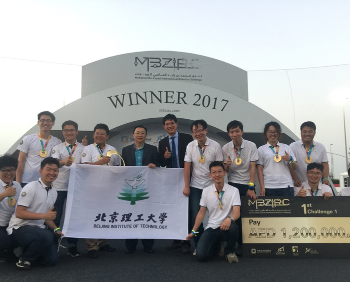 2017年3月23日,北京理工大学“飞鹰”队在阿联酋阿布扎比举办的穆罕穆德·本·扎耶德国际机器人挑战赛(MBZIRC2017)上,夺得冠军!