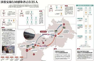 7月22日,江苏省淮安市洪泽区某企业组织67名员工前往张家界旅游。7月27日,旅行团返程途中从荆州火车站乘坐D3078次列车到达合肥,再换包车返回洪泽区。根据淮安官方通报,截至8月1日,旅行团中已有12人(包括员工家属)核酸阳性。连日来,多地通报了涉荆州火车站候车厅及7月27日D3078次列车的本地感染者。截至8月2日,涉淮安旅行团感染者已有25人。