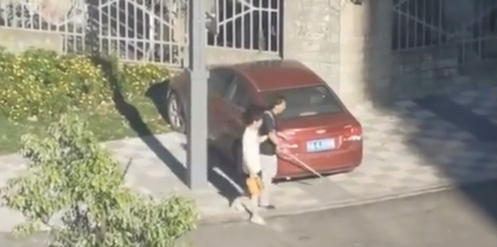 ·暖心!四川成都一名盲人在路上行走时,私家车堵住了路边的盲道,好心小伙看到后上前相助。