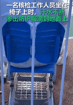 8月1日,江苏扬州一名核酸检测志愿者穿着防护服坐在椅子上时,汗水不断渗出滴到地面上。