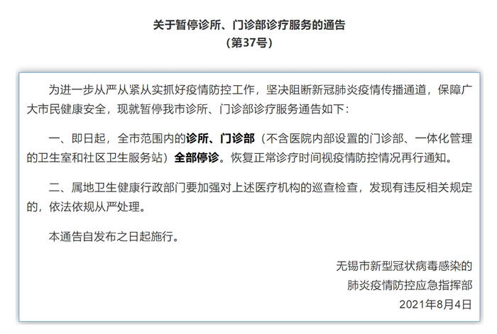 原标题:江苏无锡市8月4日起暂停诊所、门诊部诊疗服务