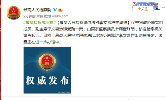 辽宁省政协原党组成员、副主席李文喜涉嫌受贿一案,由国家监察委员会调查终结,移送检察机关审查起诉。日前,最高人民检察院依法以涉嫌受贿罪对李文喜作出逮捕决定。该案正在进一步办理中。