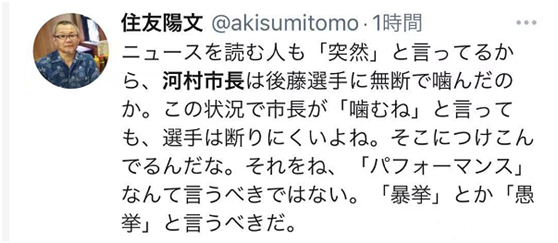 “播音员报道时使用了‘突然’一词,可以看出河村隆之在咬金牌之前,没有征得后藤希友的同意。不过,在这种情况下,即使市长提前告诉运动员‘我要咬金牌’,运动员也很难拒绝。河村隆之就是仗势欺人。这种举措应该被称为‘暴行’或者‘愚蠢的行为’。”