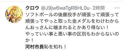有网友为后藤希友感到气愤,痛骂道:“垒球选手后藤希友努力努力再努力终于夺得的金牌,被不知从哪冒出来的‘大叔’咬了,令人难以置信!不知道什么该做什么不该做吗!河村市长你要知耻!”。