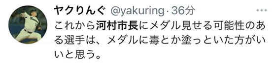 甚至有网友说道,“如果之后还有运动员可能要拿金牌给河村市长看,最好预先在金牌上涂上毒药”。↓