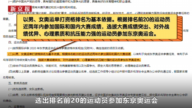 东京奥运会乒乓球选拔,以男、女奥运单打资格排名为基本依据,选出排名前20的运动员参加东京奥运会。