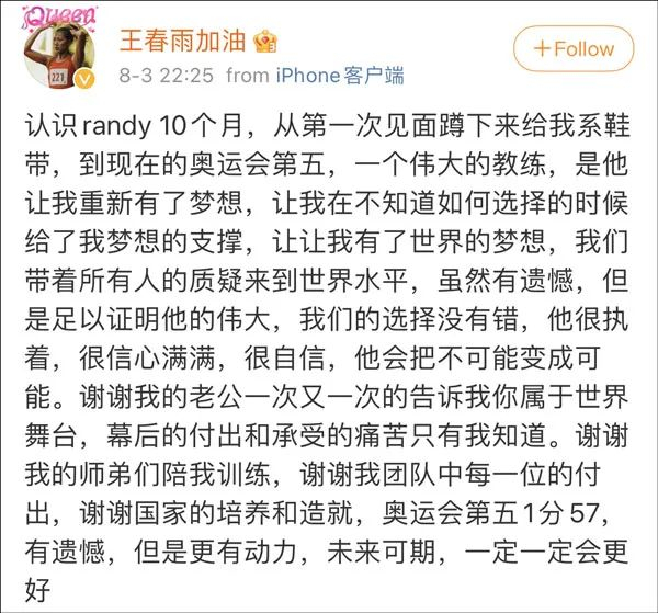 北京时间8月3日晚,赛后王春雨在微博发文,再次感谢这位给她信心的教练:“认识Randy10个月,从第一次见面蹲下来给我系鞋带,到现在的奥运会第五,一个伟大的教练,是他让我重新有了梦想,让我在不知道如何选择的时候给了我梦想的支撑,让让我有了世界的梦想,我们带着所有人的质疑来到世界水平,虽然有遗憾,但是足以证明他的伟大,我们的选择没有错,他很执着,很信心满满,很自信,他会把不可能变成可能。”