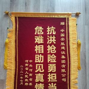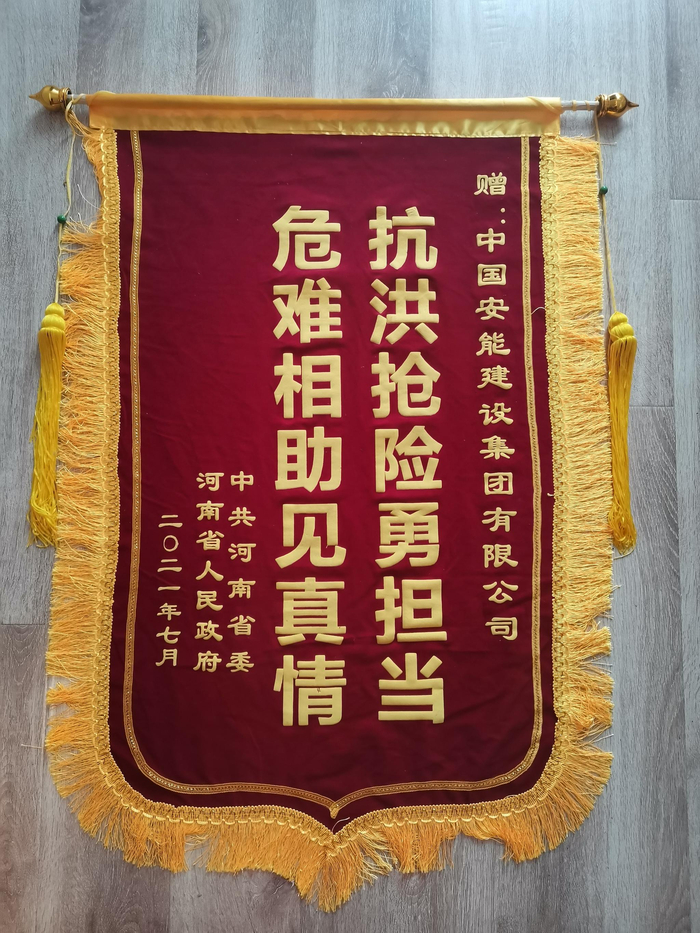 7月29日,河南省委、省政府相关人员深入郑州市郑东新区中国安能救援队员宿营地,将一面绣有“抗洪抢险勇担当 危难相助见真情”的锦旗献给救援勇士们,称赞中国安能集团在这次抗洪抢险中保持了人民子弟兵本色,是一支全心全意为人民服务和能打硬仗的专业队伍,并代表省委、省政府对中国安能抢险救援队表示崇高敬意和衷心感谢。自7月20日首批抢险队员抵达郑州以来,中国安能专业抢险队已在河南奋战近十日。