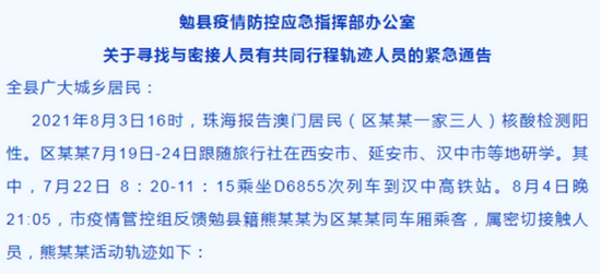 2021年8月5日上午,汉中勉县疫情防控应急指挥部办公室发布关于寻找与密接人员有共同行程轨迹人员的紧急通告 。