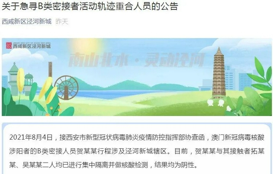 2021年8月4日,接西安市新型冠状病毒肺炎疫情防控指挥部协查函,澳门新冠病毒核酸涉阳者的B类密接人员贺某某行程涉及泾河新城辖区 。
