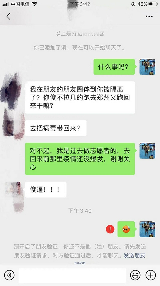 下午已经有人(陌生网友)发微信问我了,说“你傻不拉几的跑去郑州又跑回来干嘛?去把病毒带回来?”我想解释,我是去做志愿者,是主动隔离的,核酸都是阴性,还没有一个(解释)机会,就被(对方)删除(好友)了。