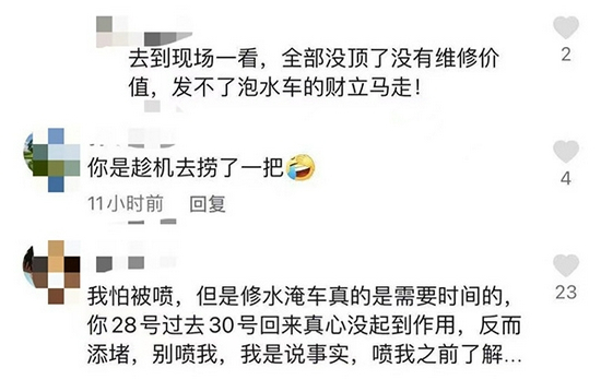 后来抖音(也有留言),说“你去这几天,能做什么东西?能修几辆车?”“那么远去做志愿者,你就想去捞一笔,或者搞些水淹车去卖。”“(7月)30号回来,反而添堵”。