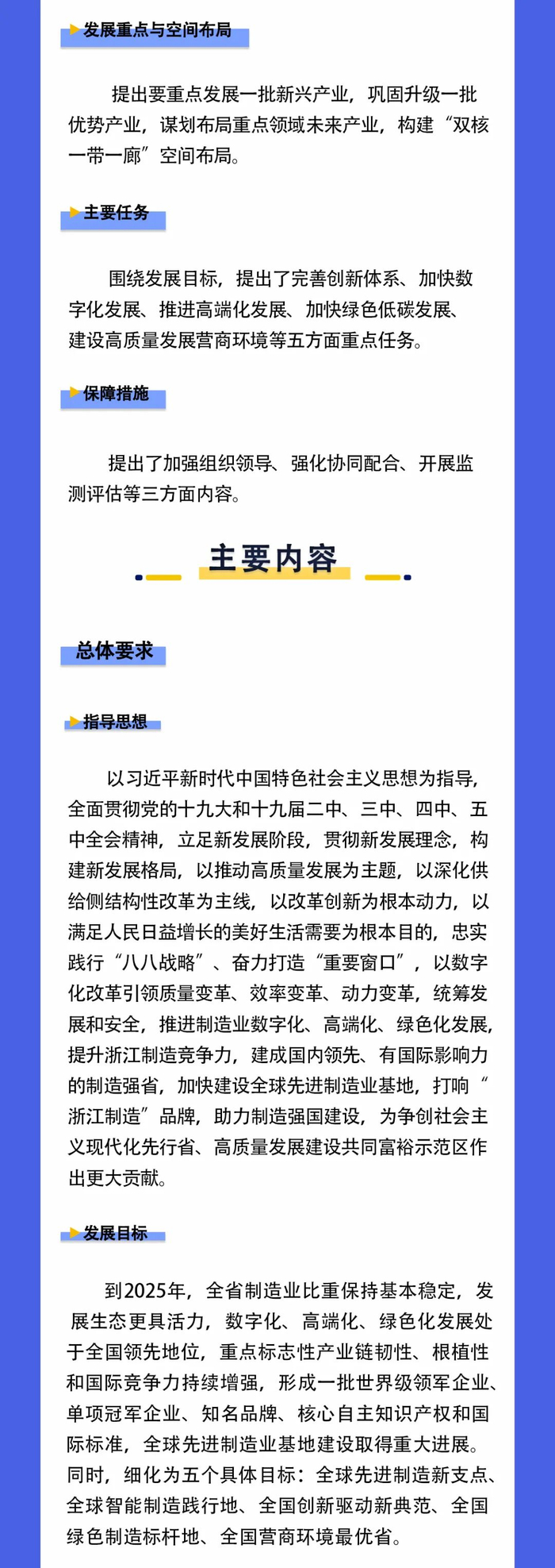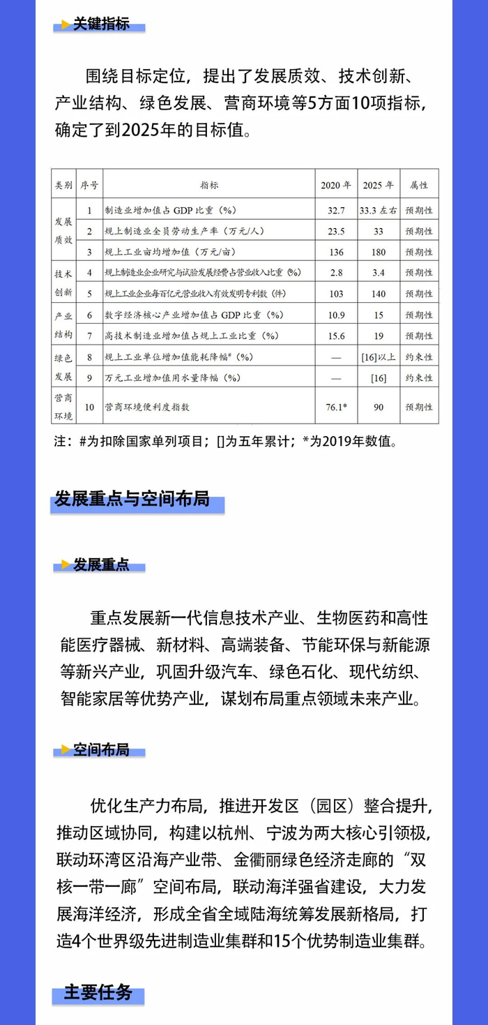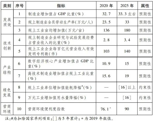 《规划》提出:到2025年,全省制造业比重保持基本稳定,发展生态更具活力,数字化、高端化、绿色化发展处于全国领先地位,重点标志性产业链韧性、根植性和国际竞争力持续增强,形成一批世界级领军企业、单项冠军企业、知名品牌、核心自主知识产权和国际标准,全球先进制造业基地建设取得重大进展。