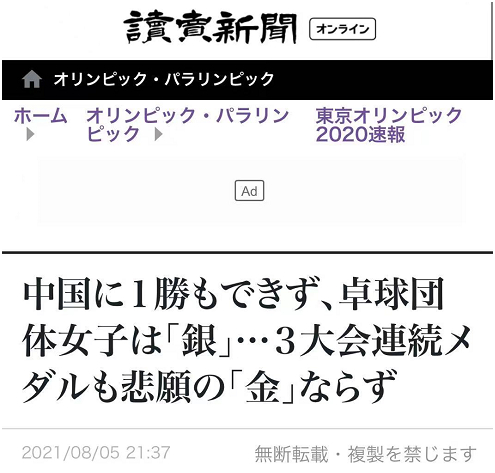 日本《读卖新闻》报道赛果时在标题中写道,“对阵中国(大比分)连一盘都没赢、(日本)乒乓女团获‘银牌’,连续三届奥运会都没有获得梦寐以求的金牌”。